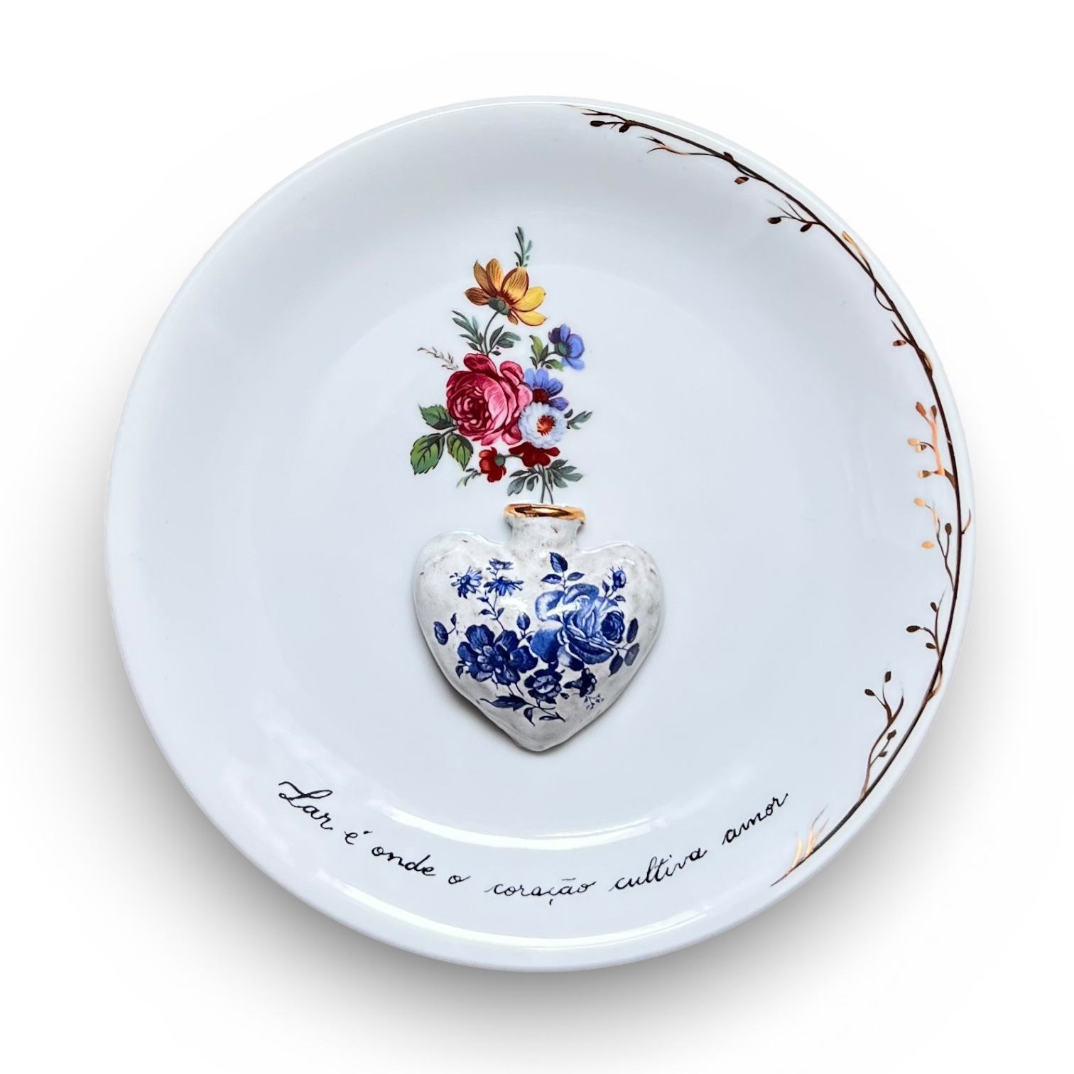 A escultura do coração foi modelada à mão e aplicada ao prato, criando relevo e profundidade — marca essencial dos pratos-poema. Com flores delicadas em azul cobalto, ele sustenta a papoula como quem sustenta o afeto no cotidiano.