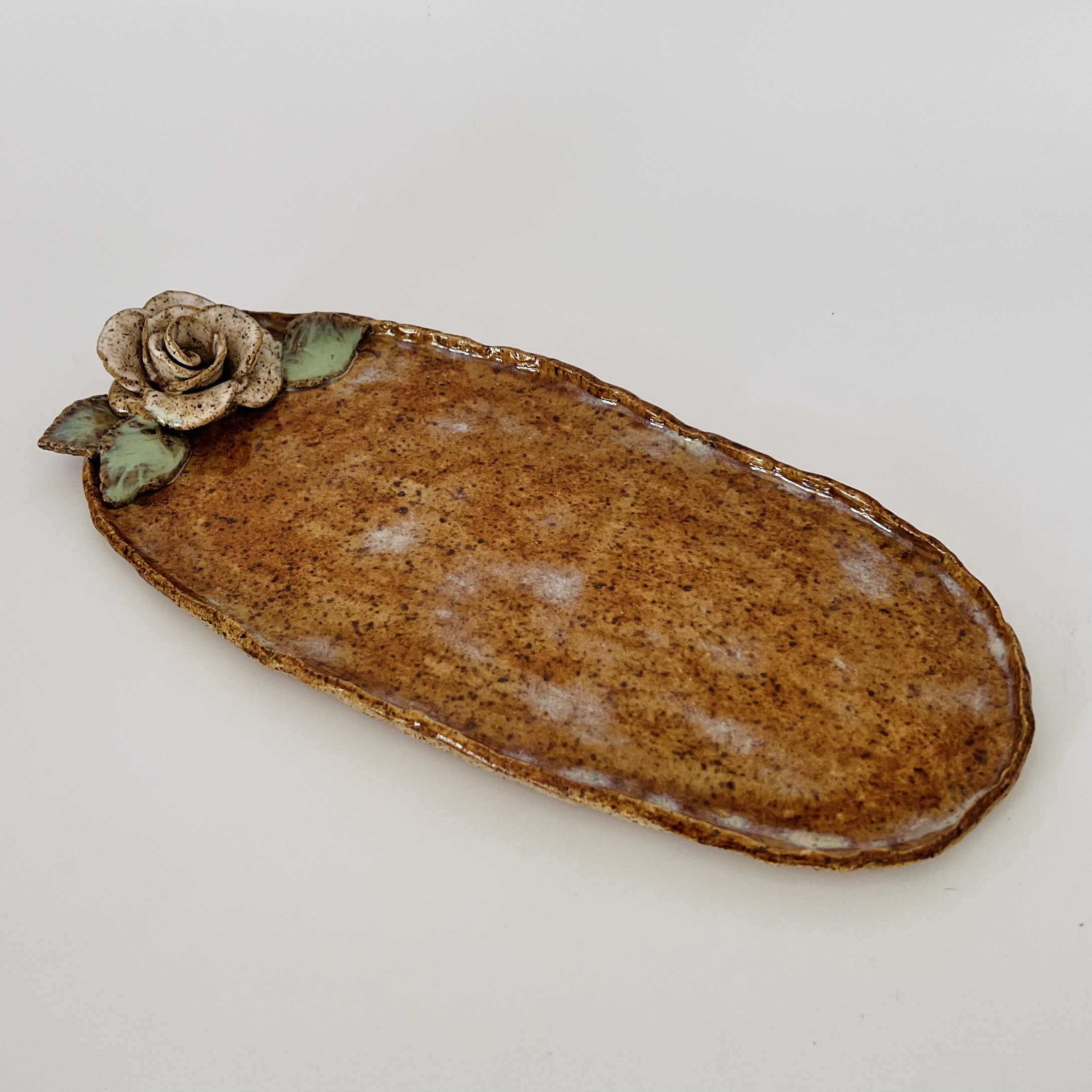 Uma rosa delicada e suas folhas ornamentam uma das pontas desta bandeja de 28 x 13,5 cm.