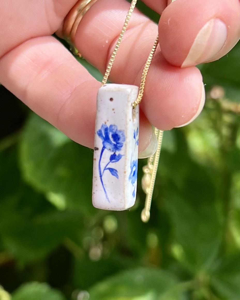 Modelado em argila e pintado com delicados motivos florais em azul cobalto nas três faces visíveis, é uma peça que traduz tradição e leveza.