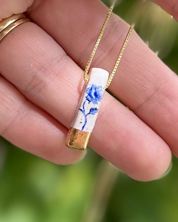 Peça única com 2,2 cm de comprimento por 1,1 cm de lado. Esse pingente possui uma abertura para passar o cordão ou corrente (não inclusos), mantendo o design limpo e natural da porcelana.