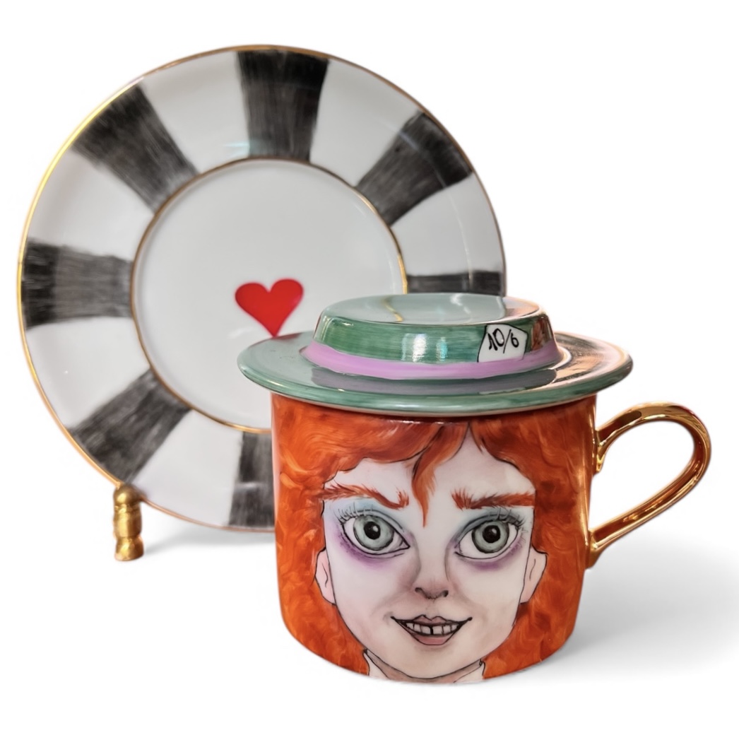 Seu rosto, pintado à mão com um toque travesso, guarda o mistério divertido de quem sabe que a vida é mais saborosa quando se mistura poesia com nonsense.