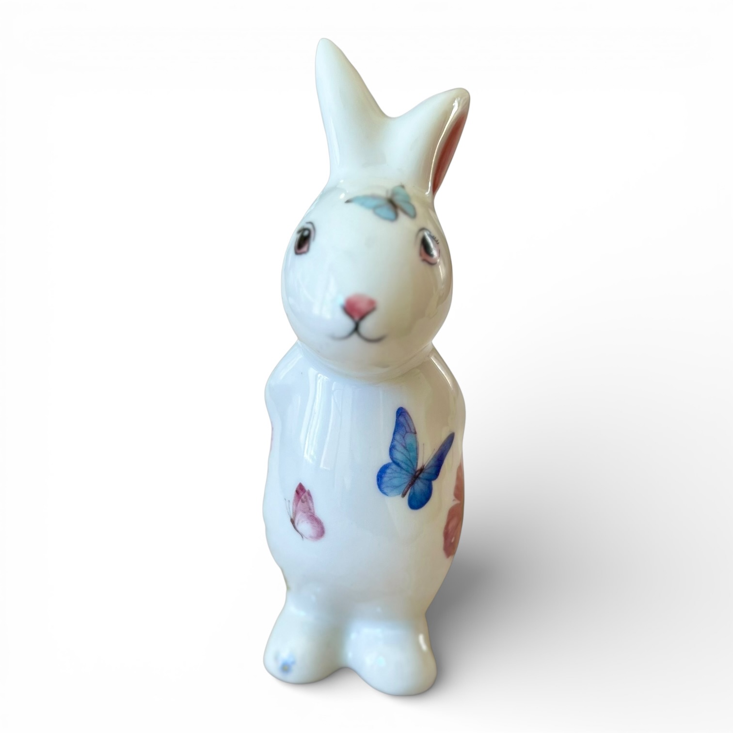Coelhinhos decorativos criados em uma coleção de Páscoa anterior do ateliê, com uma composição delicada de pintura feita à mão e pequenos complementos em decalque.