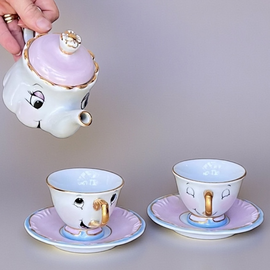 Este delicado conjunto de porcelana, pintado à mão, vai encantar adultos e crianças com sua magia e charme. Inspirado no clássico A Bela e a Fera, ele é composto por um bule e duas xícaras, Zip e Chip, agora acompanhadas por pires que completam o encanto da peça.
