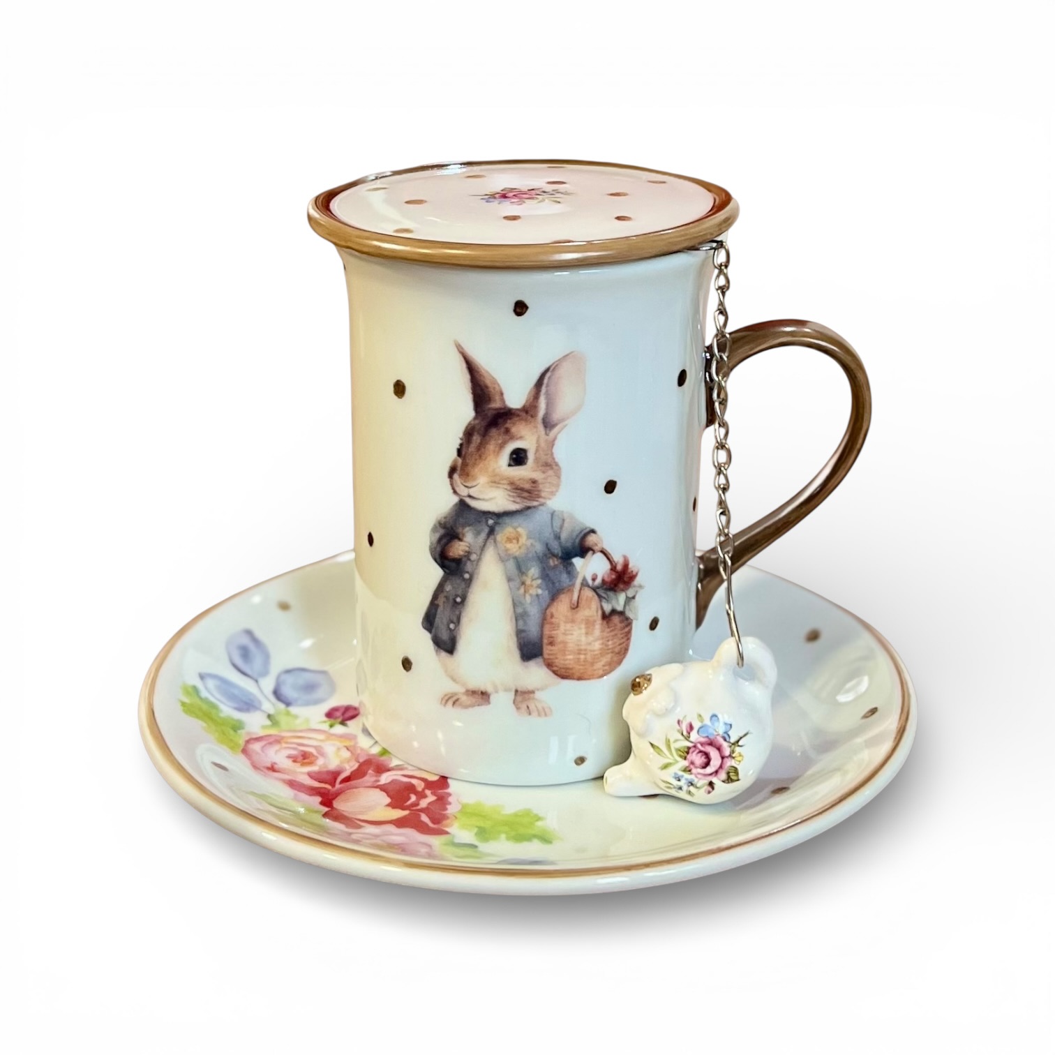 Ele é composto por uma caneca com coelhinha, tampa, infusor de chá em formato de bulinho e um pratinho para lanche.