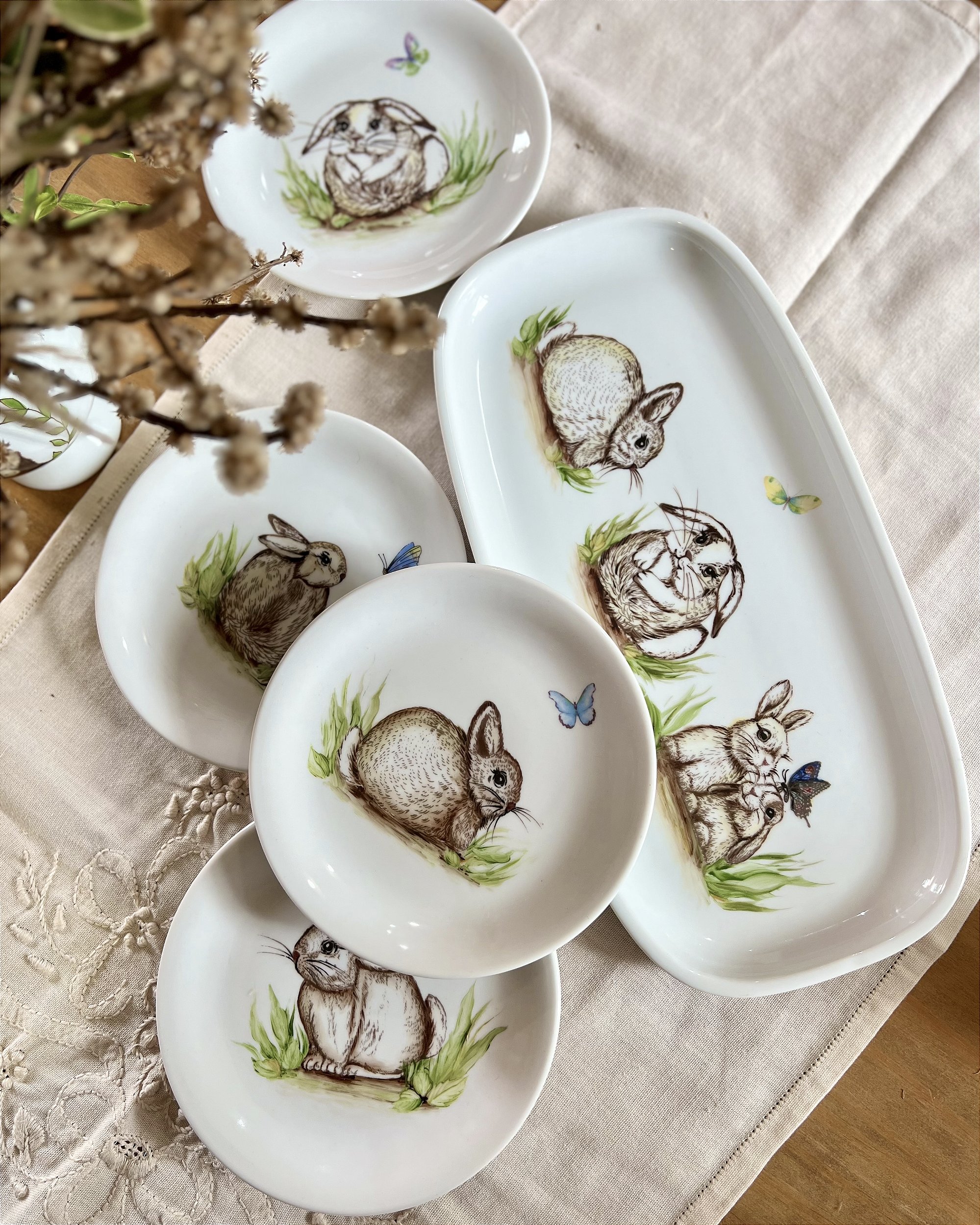 As peças trazem pintura feita à mão no ateliê, criando uma estética mais suave e orgânica, que conversa harmoniosamente com as demais peças da coleção de Páscoa.