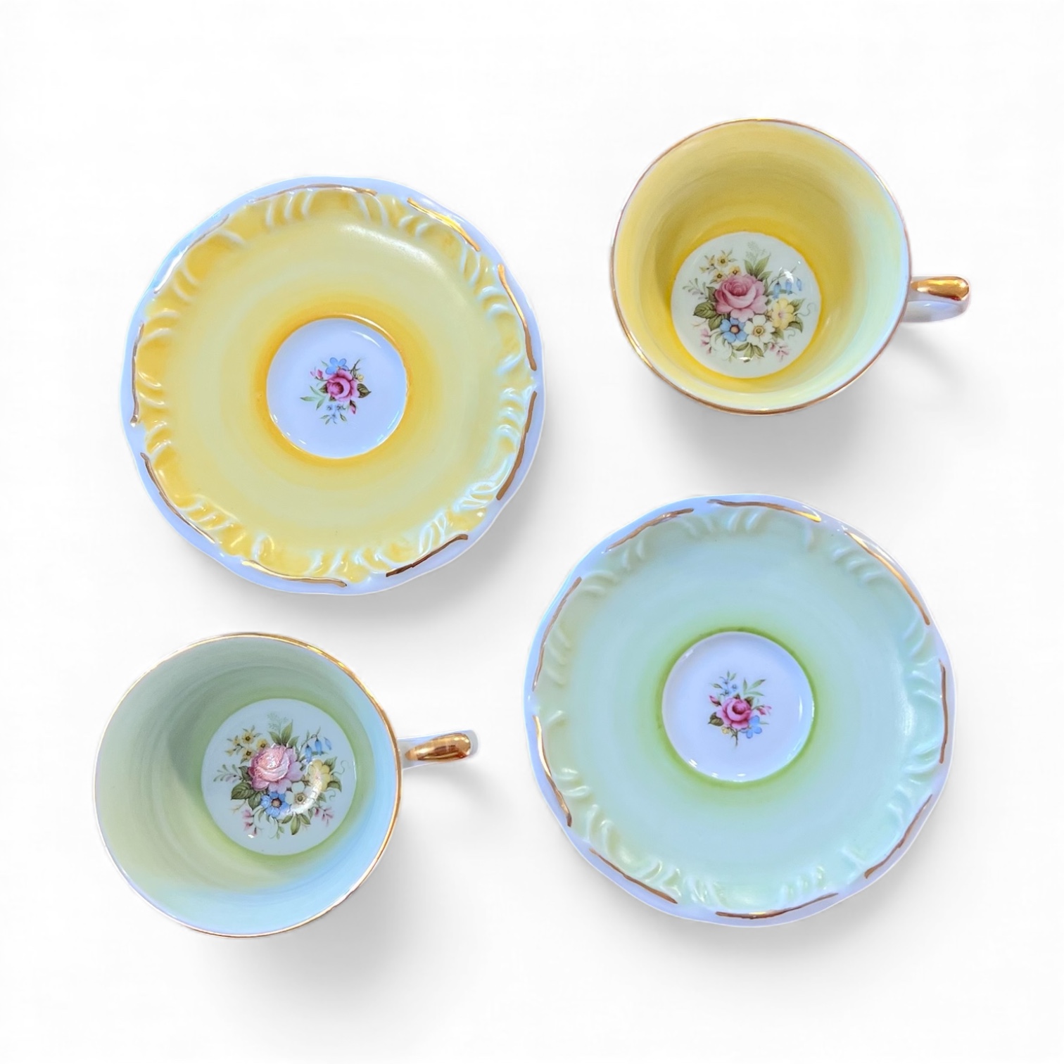 Um par que se encontra em perfeita harmonia: uma xícara verde, outra amarela, unidas pelas mesmas flores delicadas e toques de ouro que iluminam cada detalhe.