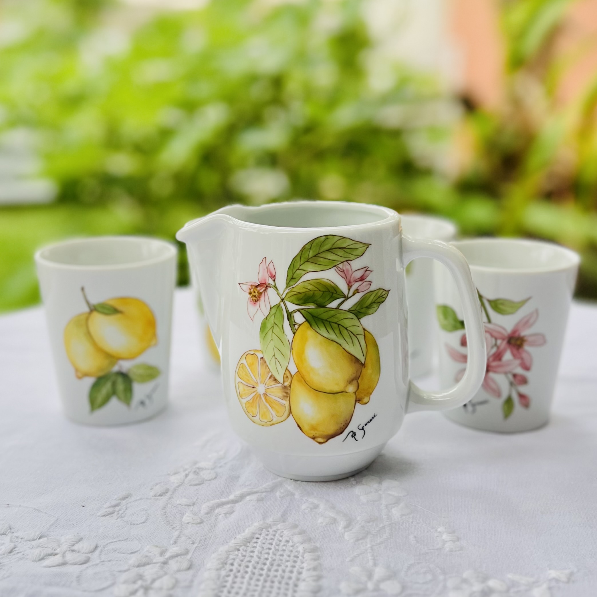 Jarra (que também pode ser usada como leiteira e vai ao micro-ondas) e quatro copos de porcelana pintados à mão com limões sicilianos — alegres, delicados e prontos para adoçar qualquer mesa com um toque de verão.