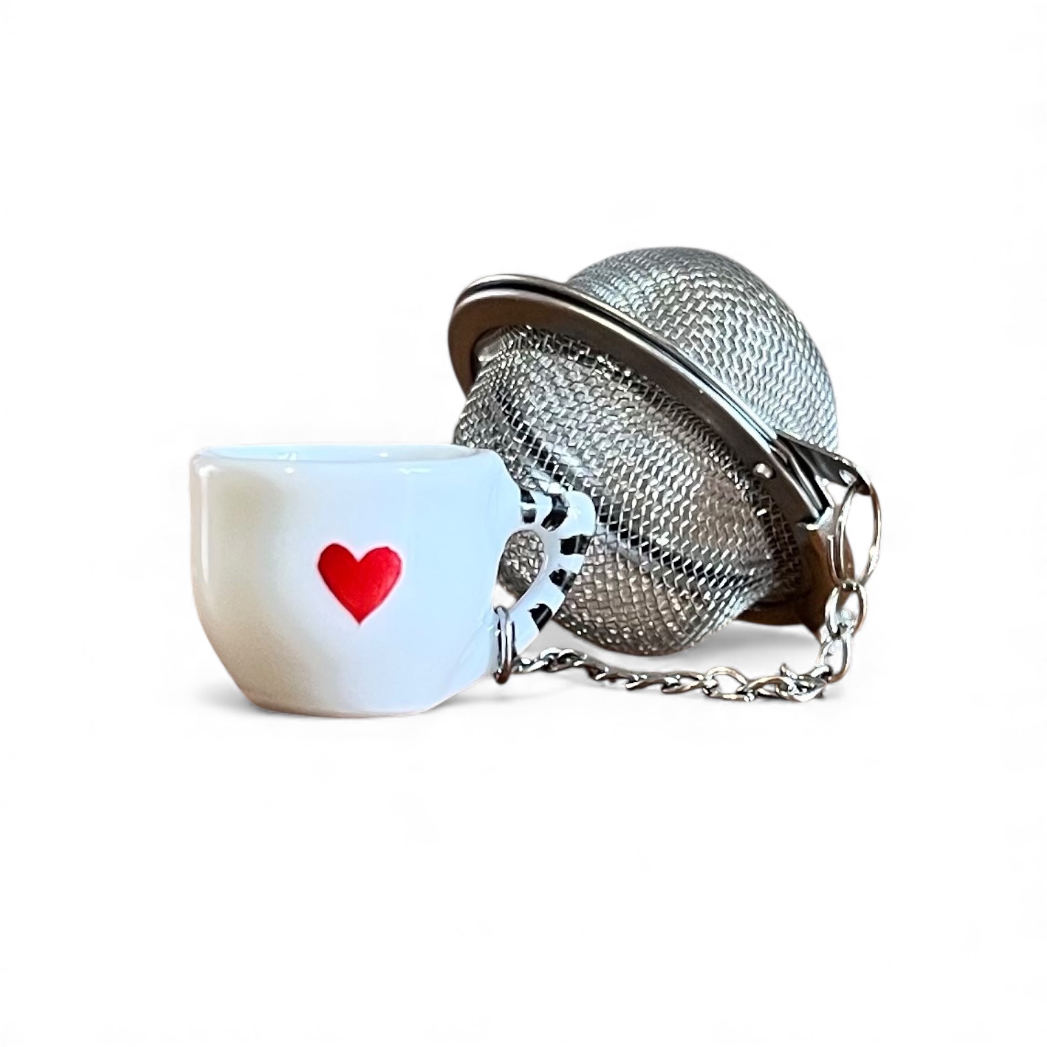 Com um coração vermelho na frente e listras pretas na alça, este infusor une charme, magia e um toque do universo de Alice. Cada detalhe foi modelado e pintado à mão, trazendo aquele encanto que transforma o momento do chá em uma pequena pausa poética.