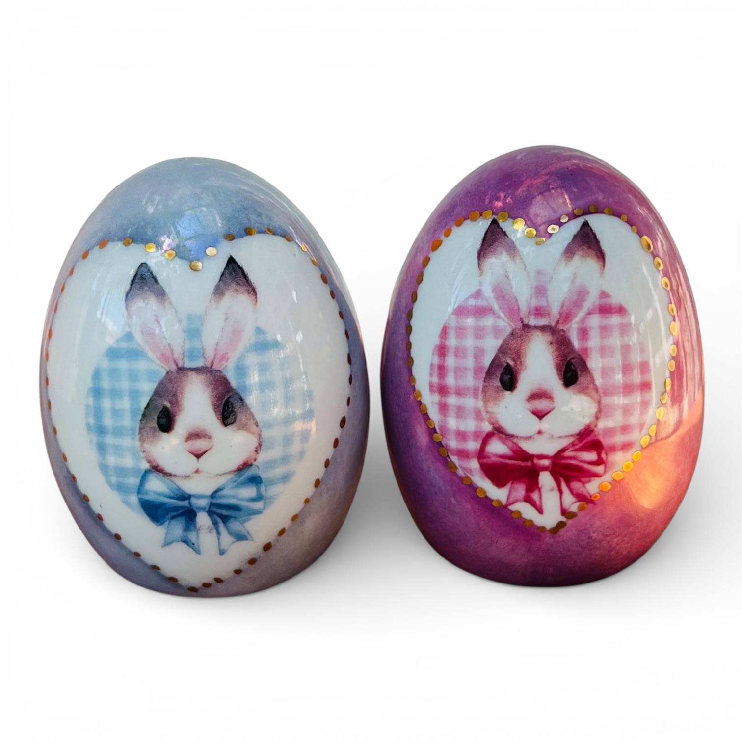Dois pequenos ovinhos decorativos de coelhinho e coelhinha, criados em coleções de Páscoa de anos anteriores do ateliê.
