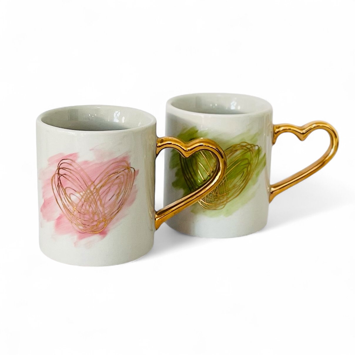 Um par de canecas cheio de ternura, com alças em forma de coração e pintura aquarelada feita à mão — uma em tom de verde suave e a outra em rosa. Sobre a delicadeza das cores, um coração estilizado dourado acrescenta um toque de brilho e carinho.