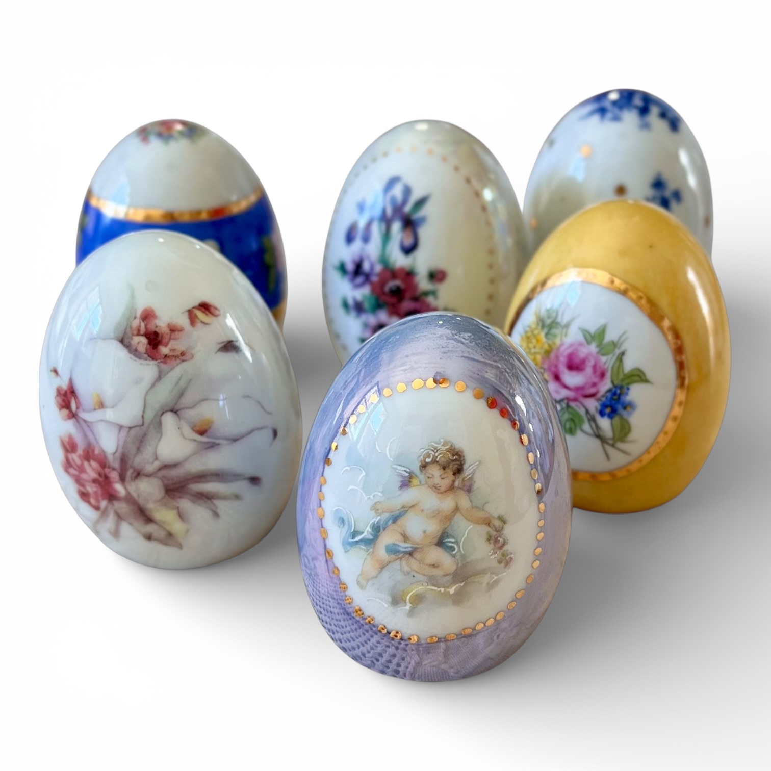 Cada peça traz uma combinação de decalques selecionados, pintura à mão e detalhes em ouro, formando composições delicadas e cheias de charme para presentear ou compor a mesa de Páscoa.