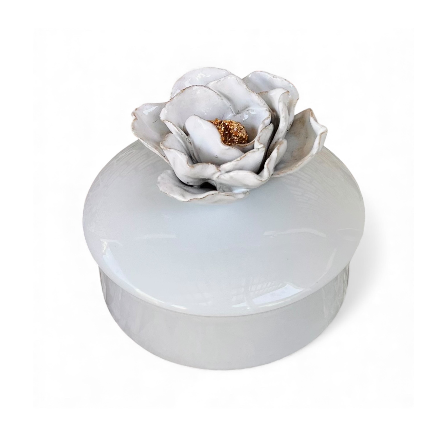 Sobre o branco da porcelana, uma peônia esculpida inteiramente à mão — pétalas suaves, volume orgânico e um miolo pintado em ouro de verdade, que ilumina a peça com um toque de elegância.
