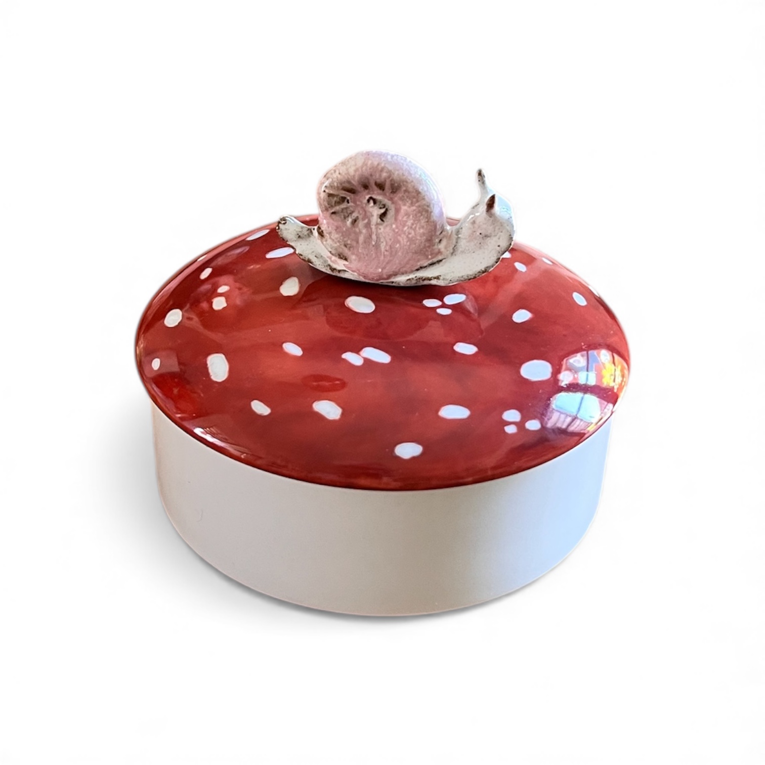 Em porcelana, ele combina o branco natural da peça com a tampa pintada à mão em vermelho com bolinhas brancas — uma referência delicada aos cogumelos mágicos dos contos. No topo, um caracol em cerâmica, modelado à mão, atua como pegador e transforma tudo em poesia.