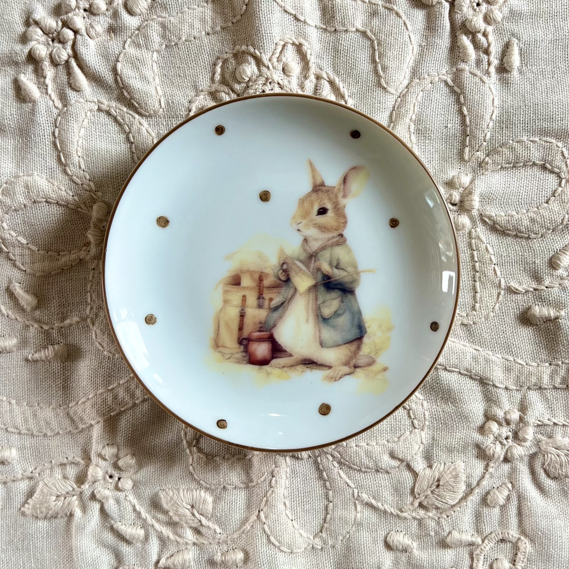 Delicado e versátil, este pratinho de 11 cm tem composição artesanal feita com decalque artístico com tema de coelhinho, combinado com pintura à mão no ateliê.