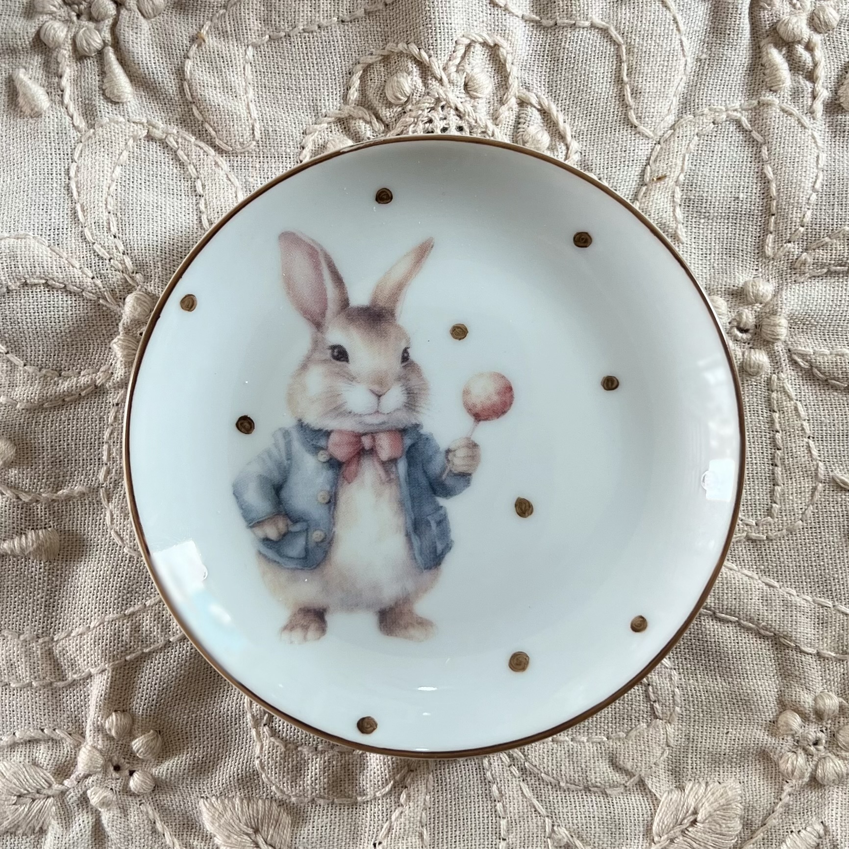 Delicado e versátil, este pratinho de 11 cm tem composição artesanal feita com decalque artístico com tema de coelhinho, combinado com pintura à mão no ateliê.