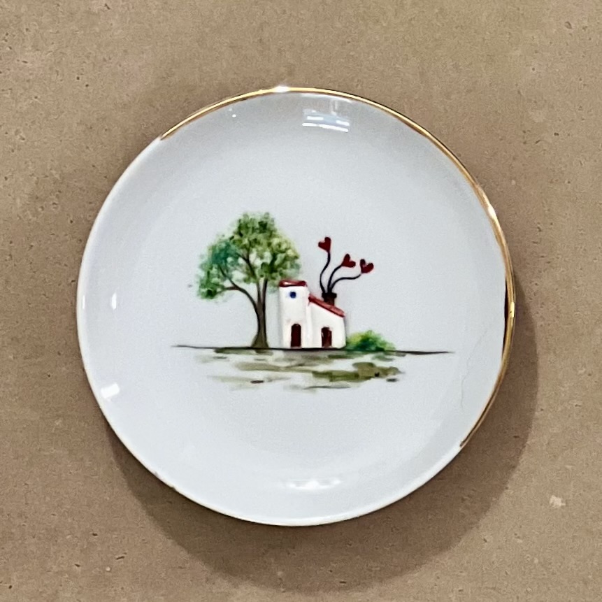 Pratinho casinha esculpida à mão, sobre uma paisagem pintada delicadamente em prato de porcelana. Pode ser gravada uma frase poética para tanto, gentileza entrar em contato pelo WhatsApp ou Instagram solicitando.