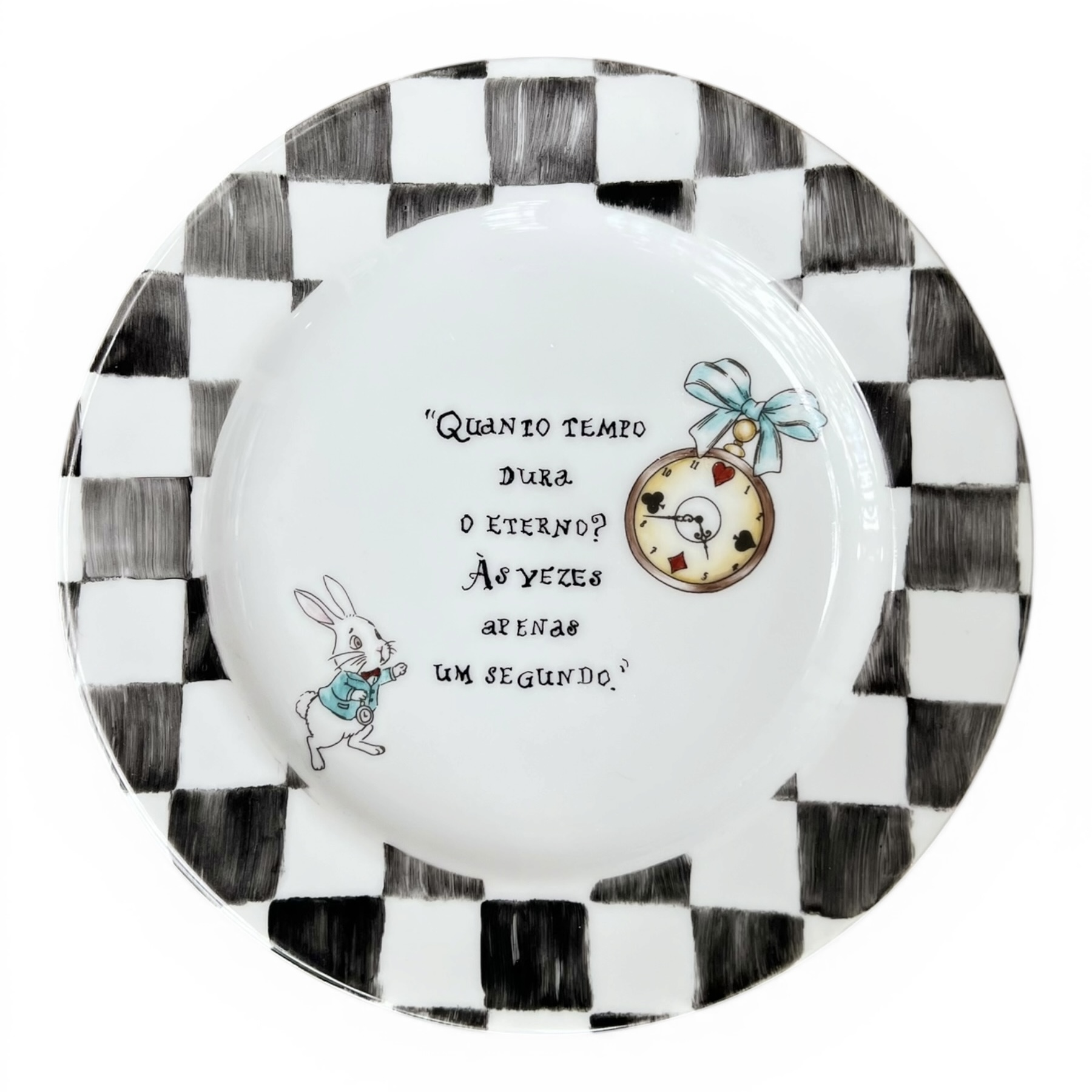 Neste prato de sobremesa, o Coelho surge apressado, segurando seu relógio pintado com um delicado laço azul — como se tentasse, em vão, colocar ordem no que nunca se deixa controlar. Ao redor, a borda quadriculada remete ao tabuleiro do Reino Encantado, onde cada instante pode mudar tudo.