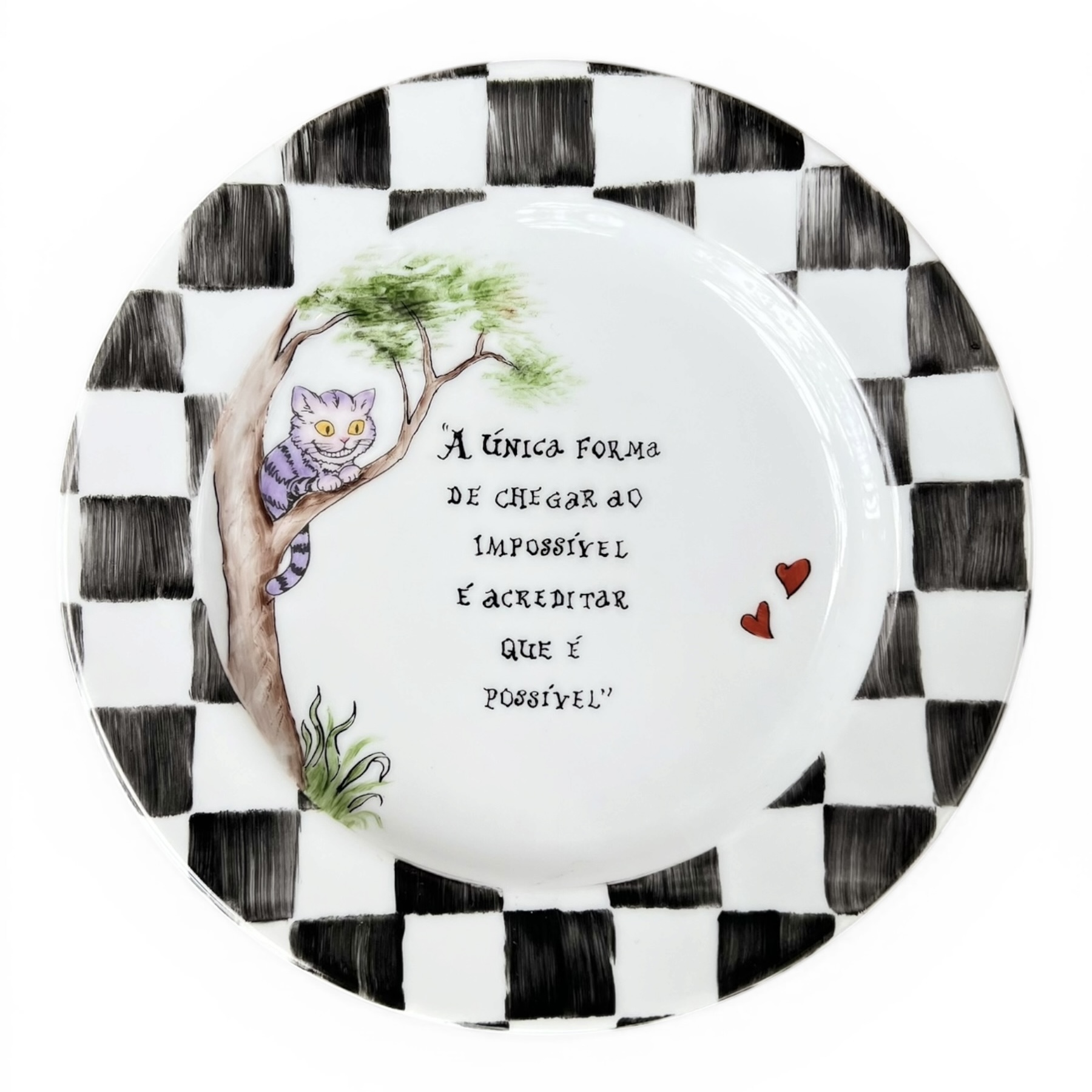 Neste prato de sobremesa, o enigmático Gato surge entre os galhos da árvore, com seu sorriso que parece saber de algo que ainda estamos prestes a descobrir. Ao redor, a borda quadriculada remete ao tabuleiro do Reino Encantado, onde tudo pode mudar com um único passo.