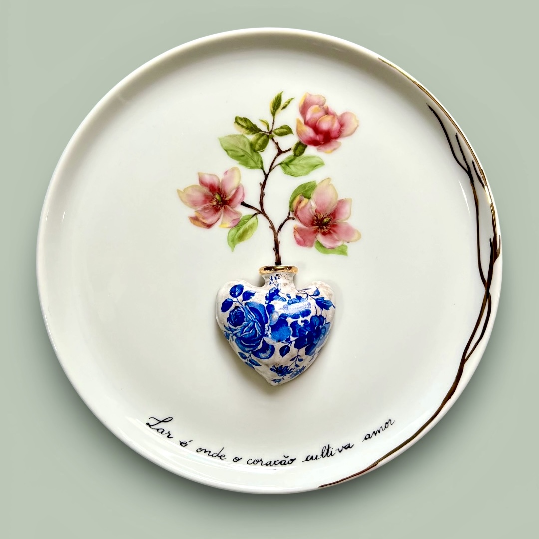 A escultura do coração foi modelada à mão e aplicada ao prato, criando relevo e profundidade — marca essencial dos pratos-poema. Com flores delicadas em azul cobalto, ele sustenta a papoula como quem sustenta o afeto no cotidiano.
