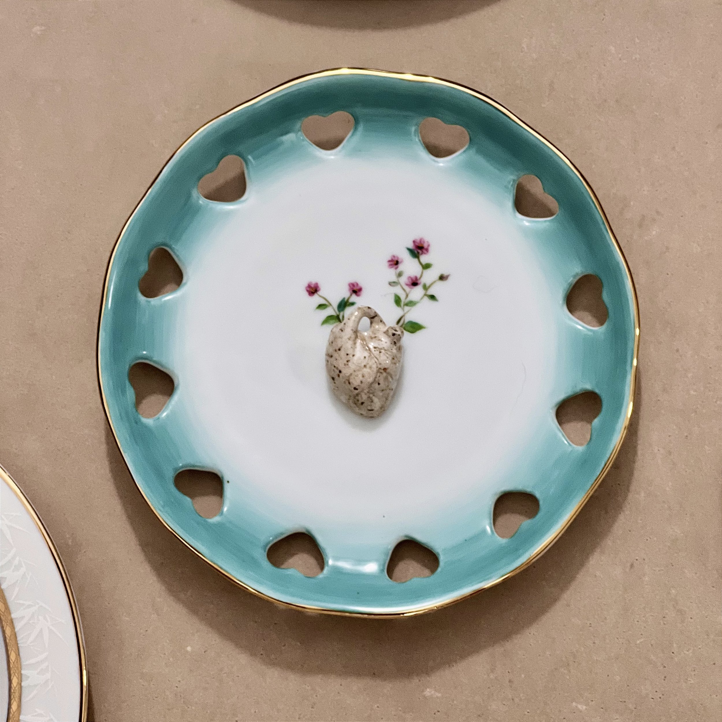Pratinho com coração, casinha e nuvens esculpidas à mão, sobre um céu pintado delicadamente em prato de porcelana.