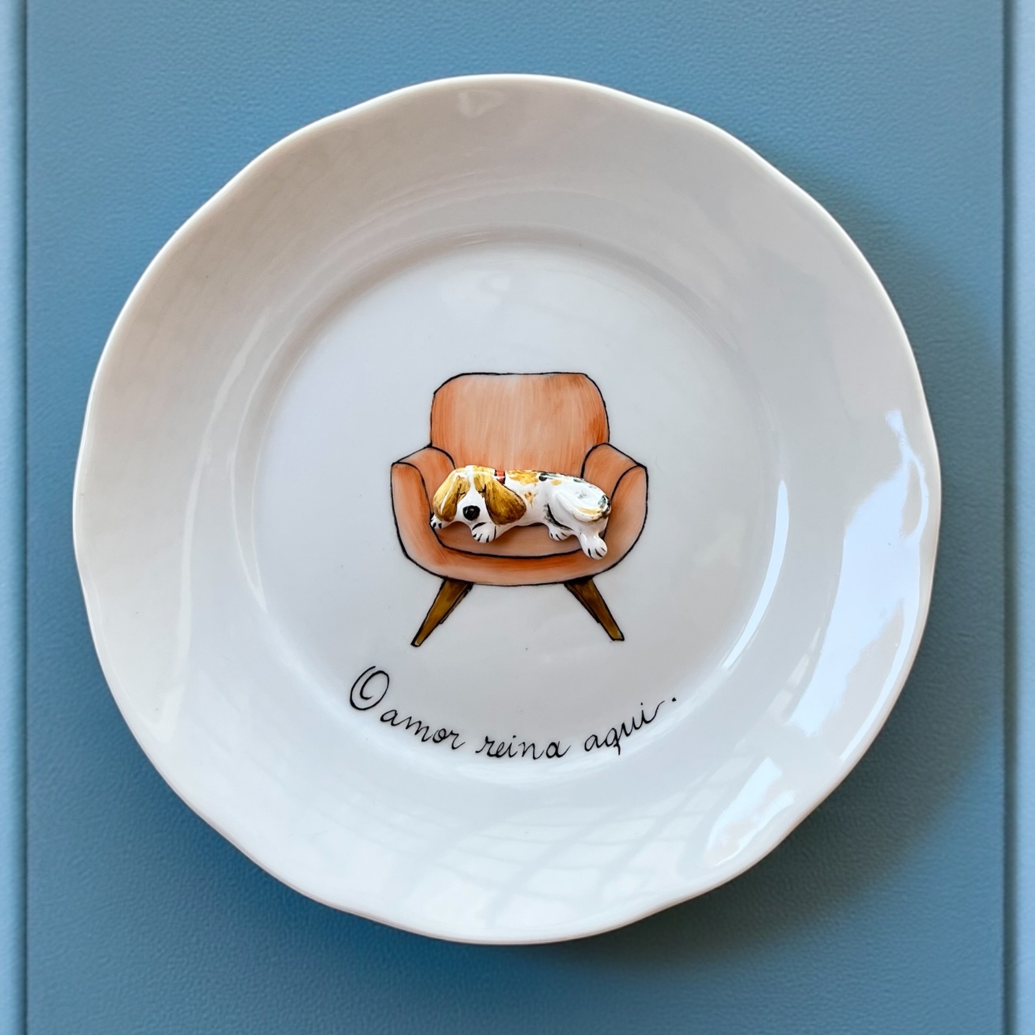 Esse prato traz pintura sobre porcelana, uma pequena escultura em cerâmica em forma de cachorrinho e a frase "O amor reina aqui".